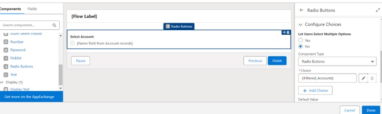 First, create a New Record Choice Set where Object selected as Account and filter criteria as per requirements.